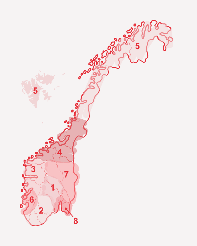 - Sone 5: Nordland, Troms og Finnmark, samt Svarbard